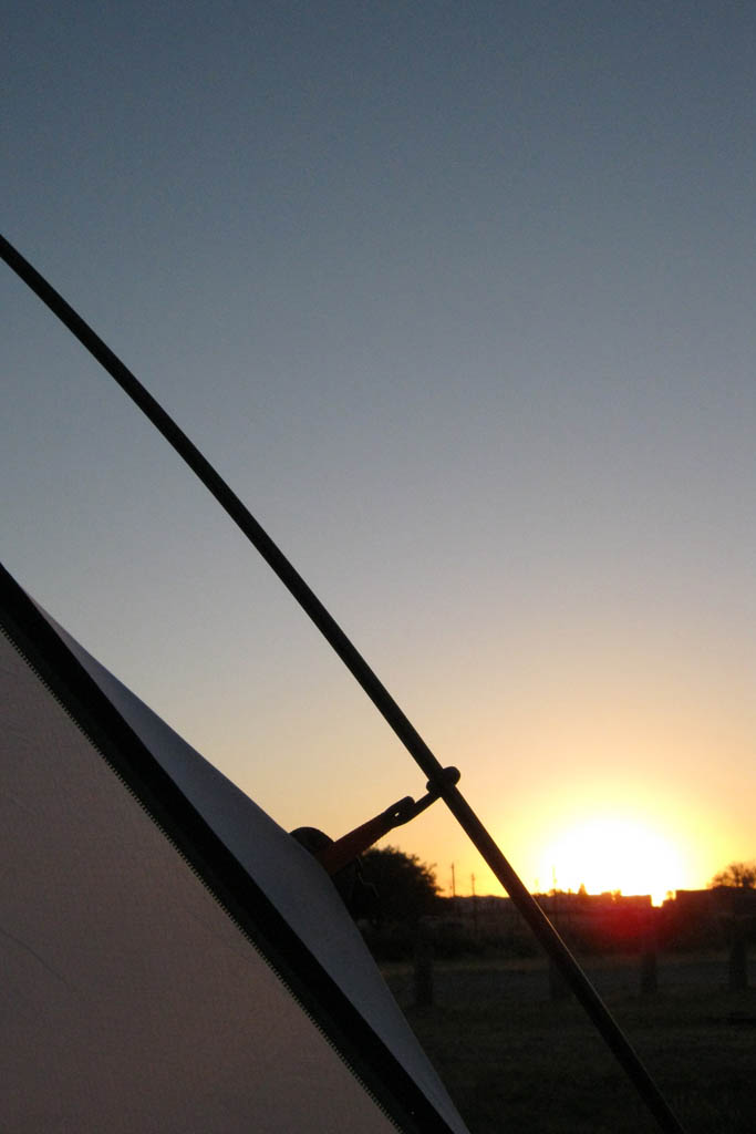 Eventually the weather improved, the boredom of the mid-west was past, and the sun rose over a clear desert horizon, seen in all its glory from within a dry, cozy tent in New Mexico.