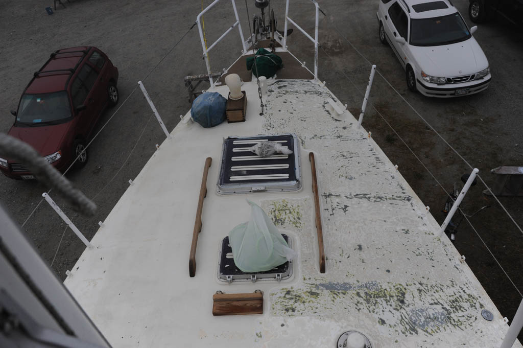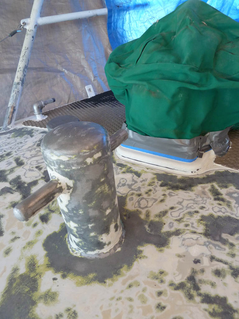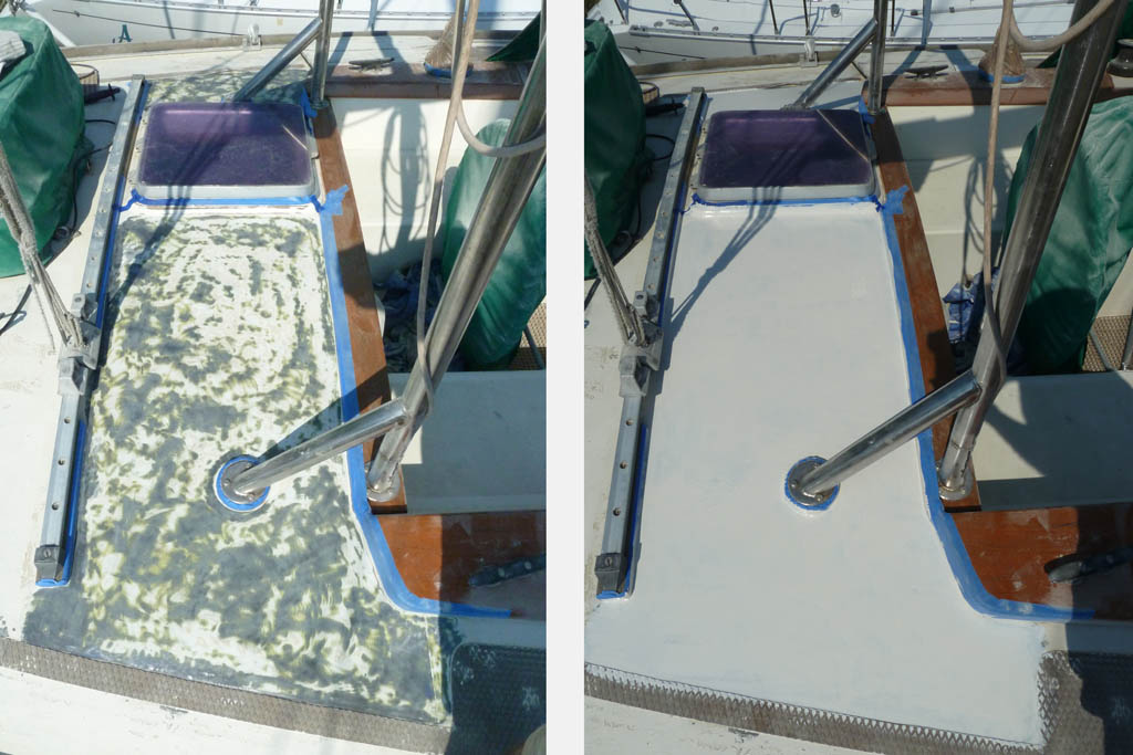 Getting started on the afterdeck, prepared and after the first coat of white epoxy primer.