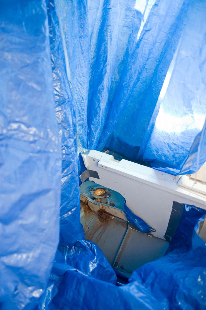 Aft cabin tented off for sand blasting the rudder shaft bushing.