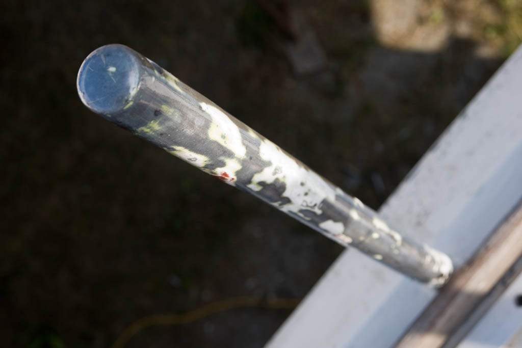 I couldn’t put it off any longer, warm summer days in Maine wouldn’t last forever and the deck wasn’t repainting itself. Let the fun begin! To make a long story short, every square inch of the deck had to be prepared. This meant grinding or sandblasting through all the layers of brittle paint down to sturdy material. If this meant only to the 20 year old primer, great. If this meant all the way to the zinc coating on the steel or even the steel itself, then so be it. This requirement resulted in exposing a tree-ring-like history of the deck, with a colorful display of 30 years of paint. In the end, roughly 20% of the deck needed grinding down to bare steel. This presented a new problem, exposed steel needs to be painted within 60 minutes of sandblasting or else the paint will adhere to the hour of corrosion that formed, not the steel itself. Quickly the entire deck became a patchwork quilt of varying degrees of preparation and painting. Luckily my friend Nicolas came to visit and we were able to put two grinders to use for a while.