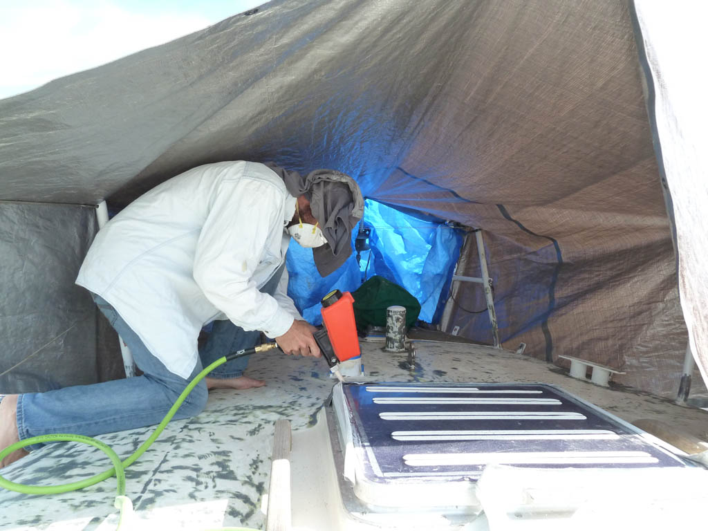 A colorful 30-year history of deck paint unfolds as grinding begins on the starboard side.