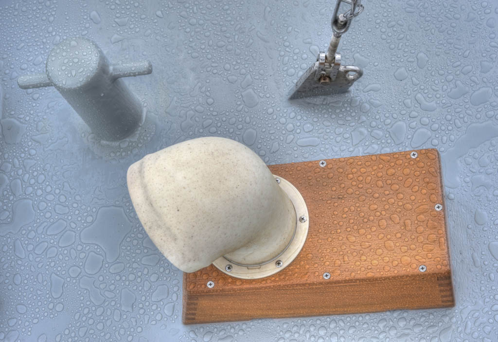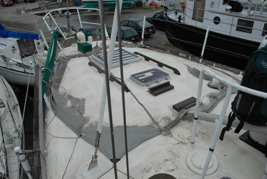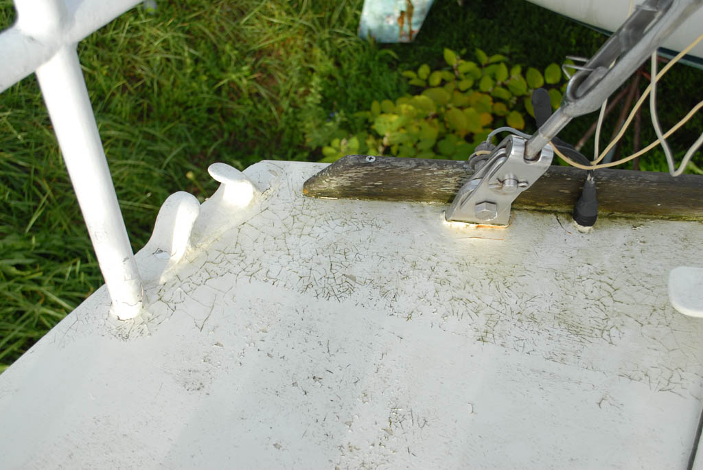 Most of the exterior paint was in very bad condition. Years of sunshine and weather had turned it brittle which led to extensive cracking. Around fittings and welded areas, some of this cracking was deep enough to have allowed moisture to reach the steel and begin localized rusting. These rust spots were rare though and overall the hull remains as structurally sound as when she was built in 1979.