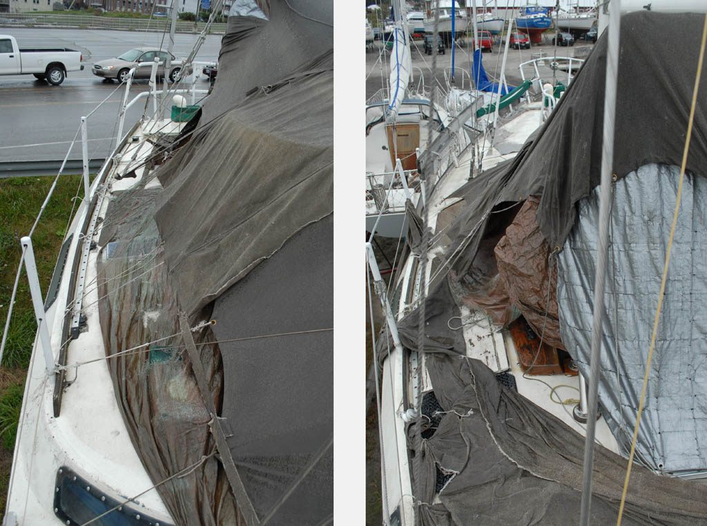 Our visits over the last 11 years have often simply been to check on things and re-tarp over the deck. First on the agenda was to machete all these tarps off and scrub away a decade of grime covering the topsides.
