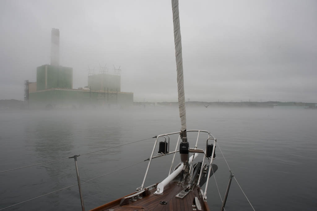 After a night at sea and close to 160 miles in heavy fog we neared the Cape Cod Canal but could see little of it through the mist. Thanks to RADAR and GPS we found our way and steered clear of invisible ships as little as half a mile away.