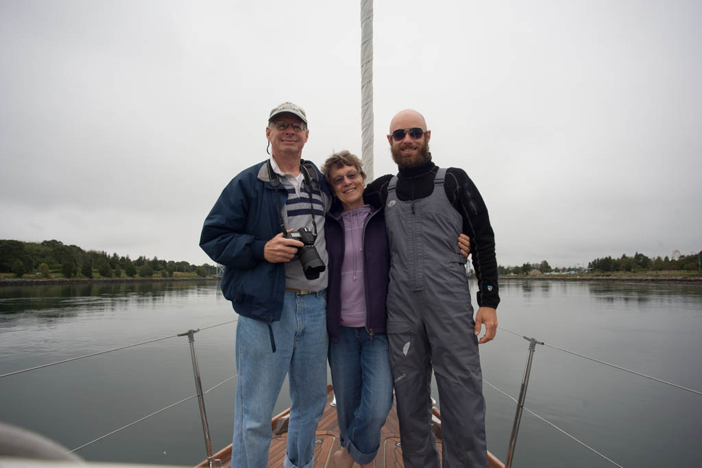 Mom and I standing on the end of the boom while reaching along at 8 knots under full sail and far from the sight of land. I can't say I know many other great-grandmothers who are this adventurous!! (Photo by Dad)