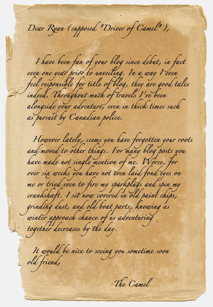 Poor thing! What could I do? Well, snow wasn’t quite falling and one sunny afternoon in the 50’s begged for a little trip to make amends with the Camel. I brushed off the paint chips, did what I could to apologize to the ugly beast, turned the key and lo the engine fired right up like some furious demon unlocked from the crypt.