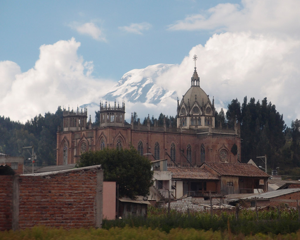 View from the bus window: Chimborazo rises behind a church near Riobamba.