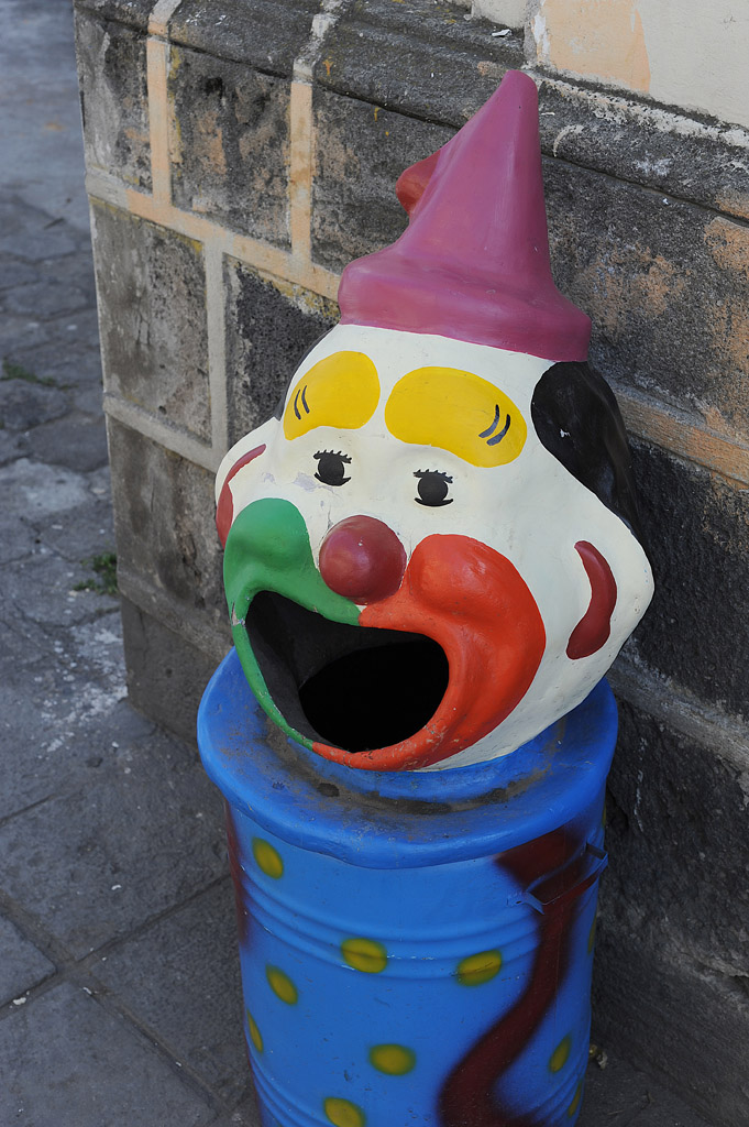 Scary clown decorations adorn many garbage cans.