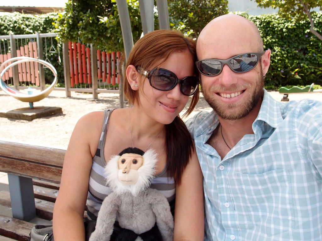 Fernanda, Tristan, and I relaxing in the Rodolfo Baquerizo Moreno Plaza.