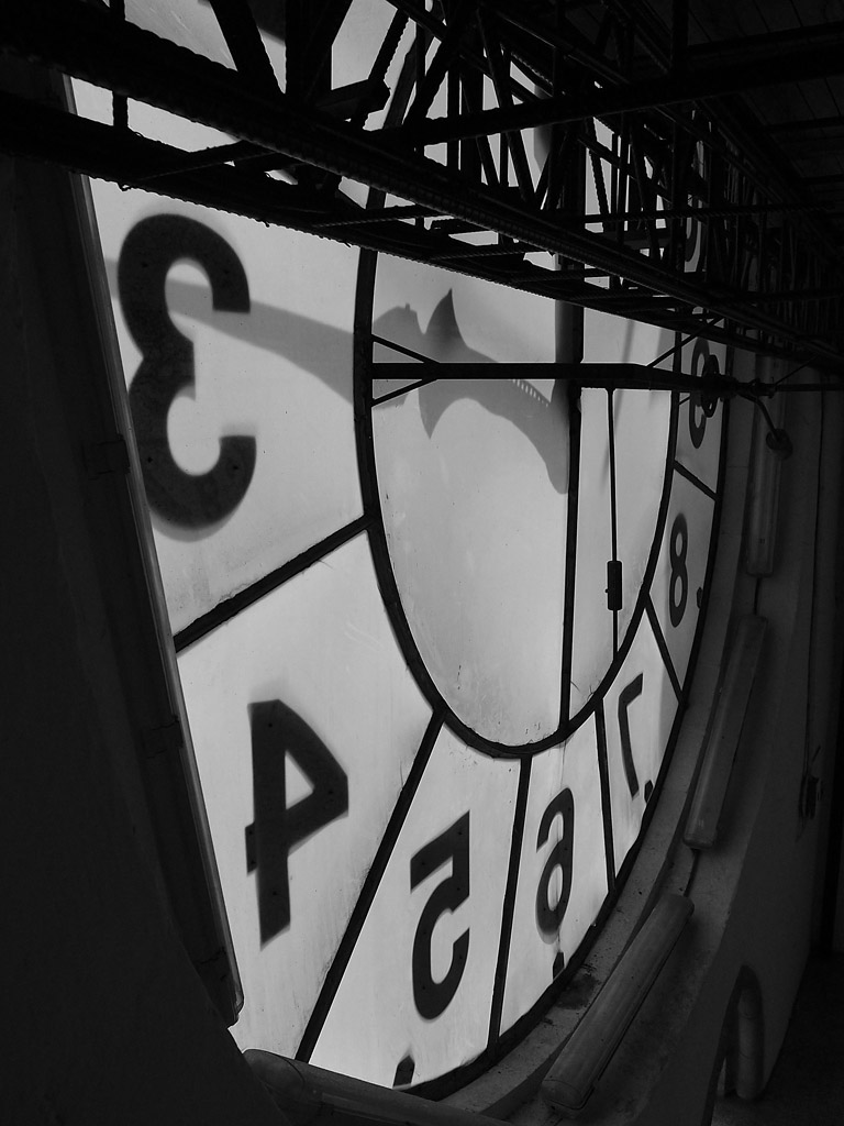 Spying on a game of basketball from the clock tower.