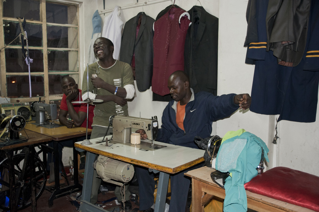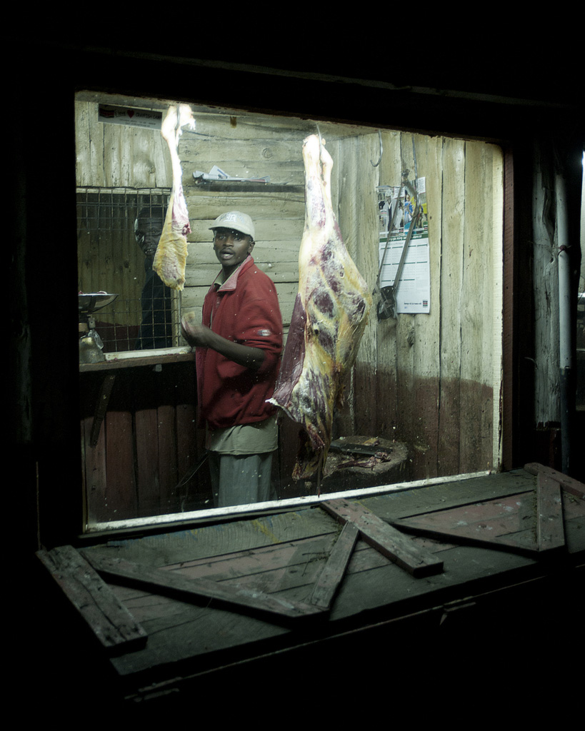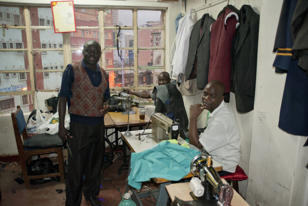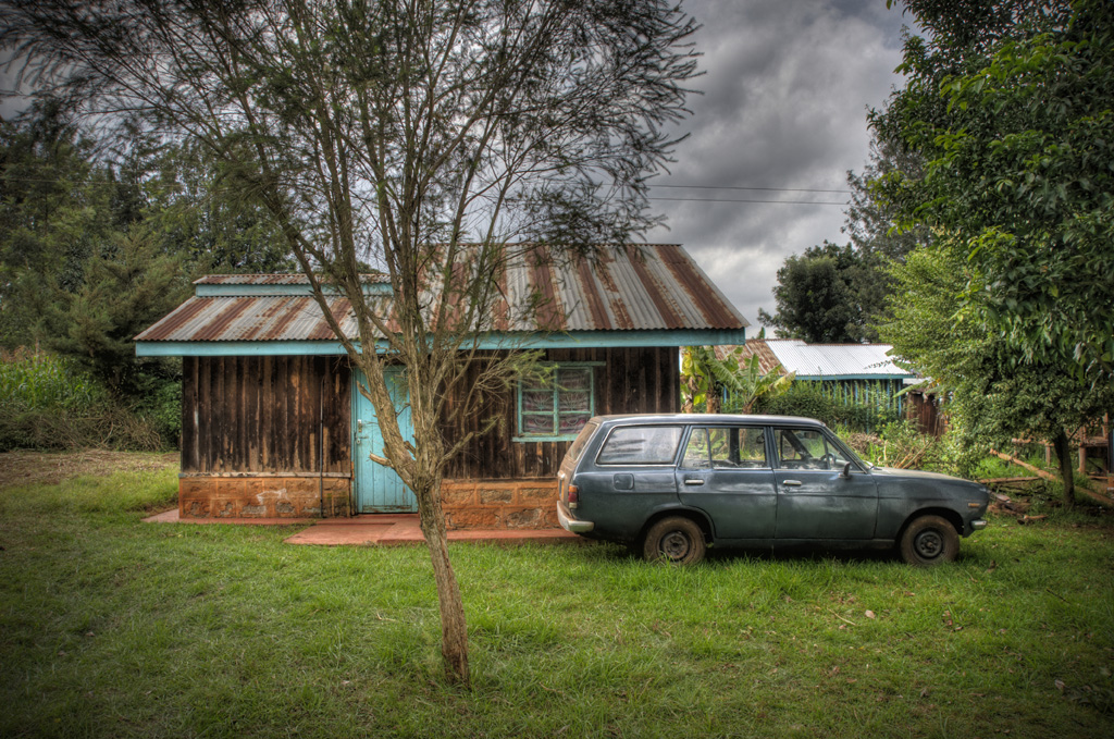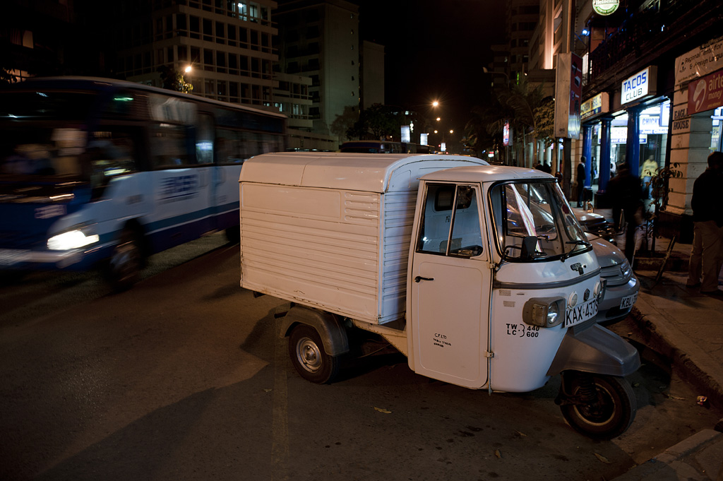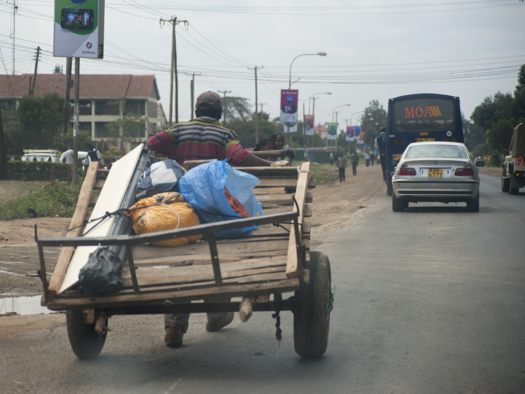 Passing a mkokoteni (hand-pulled cart) while leaving Nairobi. Somewhat of a contrast to the BMW just ahead.